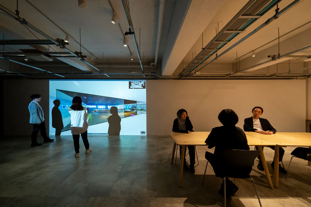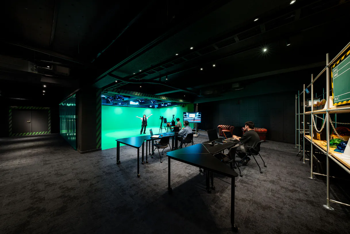 2022年10⽉に開設されたフレキシビリティと拡張性をあわせもつスタジオスペース。常に最適を探求し成⻑し続けながら、社内外に丹⻘社グループの取り組みの“今”を伝える場です。バーチャル空間や位置情報との連携などDXの推進を念頭に置いた環境を整備し、「配信・収録」のほか、「実験・シミュレーション」「展⽰イベント」などリアルとバーチャルの特性を活かし幅広く活⽤しています。