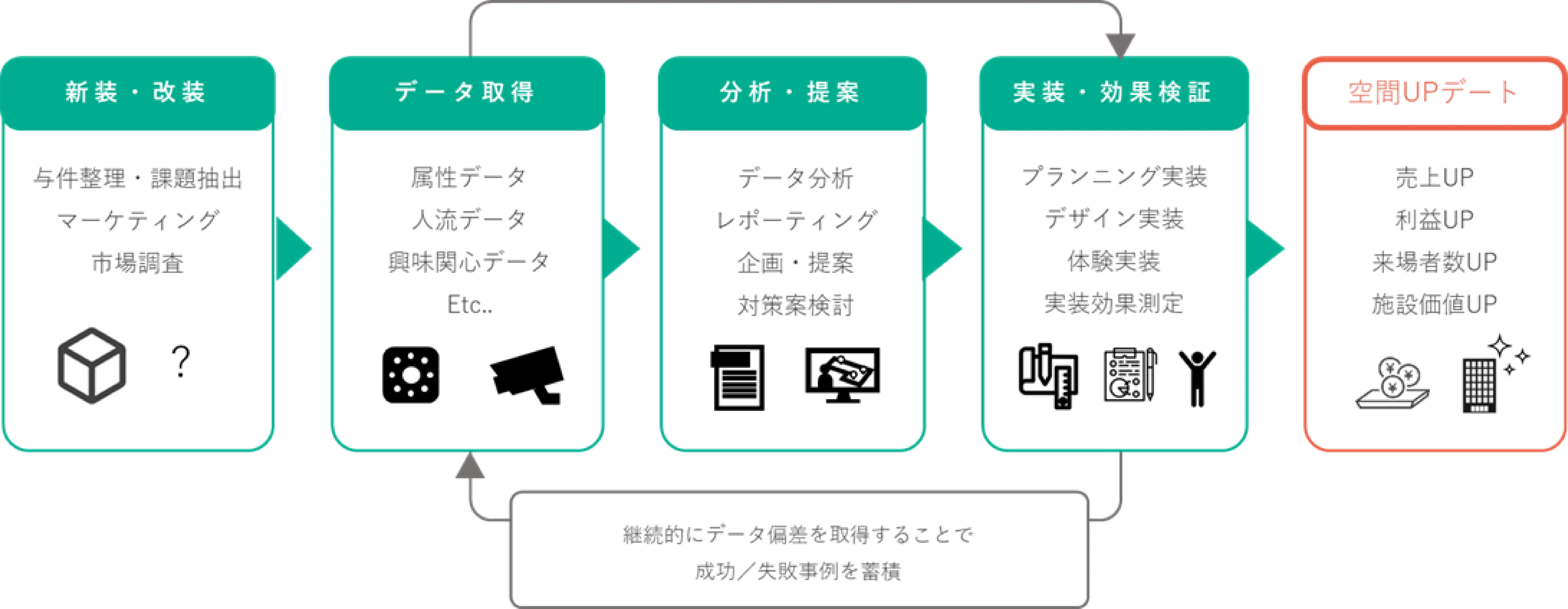 既存空間でデータ取得を行い、問題点・課題点を可視化。解決策を計画し、改装を行う際の企画・デザインに反映させることで、満足度向上や売上率向上といったKPI達成に寄与します。