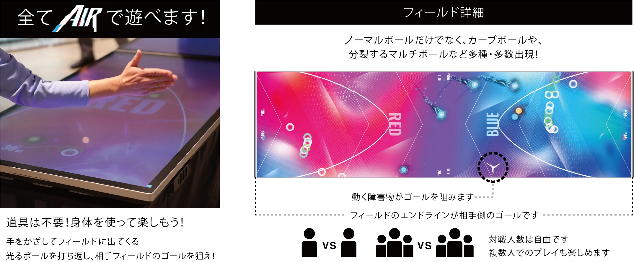 AIRエアホッケーは、センサーにより“AIR”=非接触でおこなうデジタルゲームです。ボールを打ち合い得点数を競うゲーム性、身体を動かすスポーツ性、そしてデジタルならではの演出効果をお楽しみいただけます。