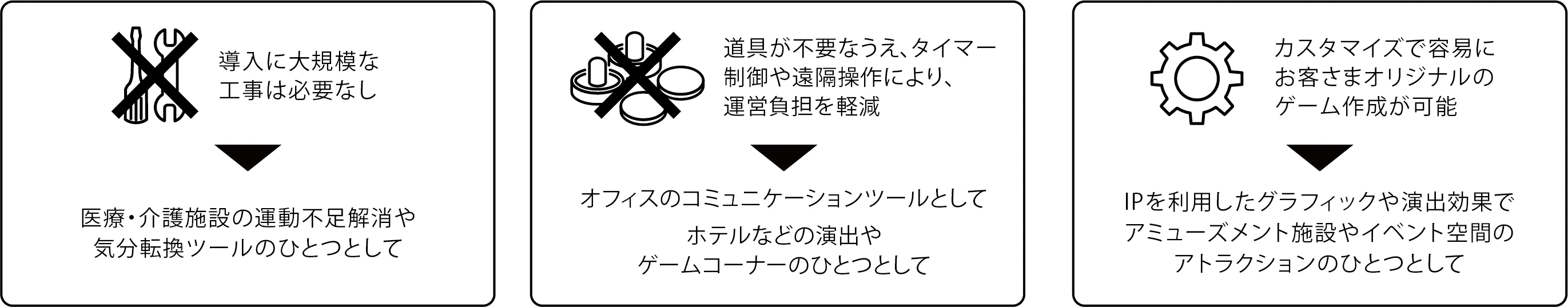 オフィス、アミューズメント施設、ホテルや旅館等、ホスピタリティ施設の遊技場、医療介護施設など、様々な施設でご活用いただけます。単純な操作性だからこそ大人でも子供でも、高齢者でも楽しむことができ、ユニティを使って制御を行うことで、空間全体を使った演出も可能です。